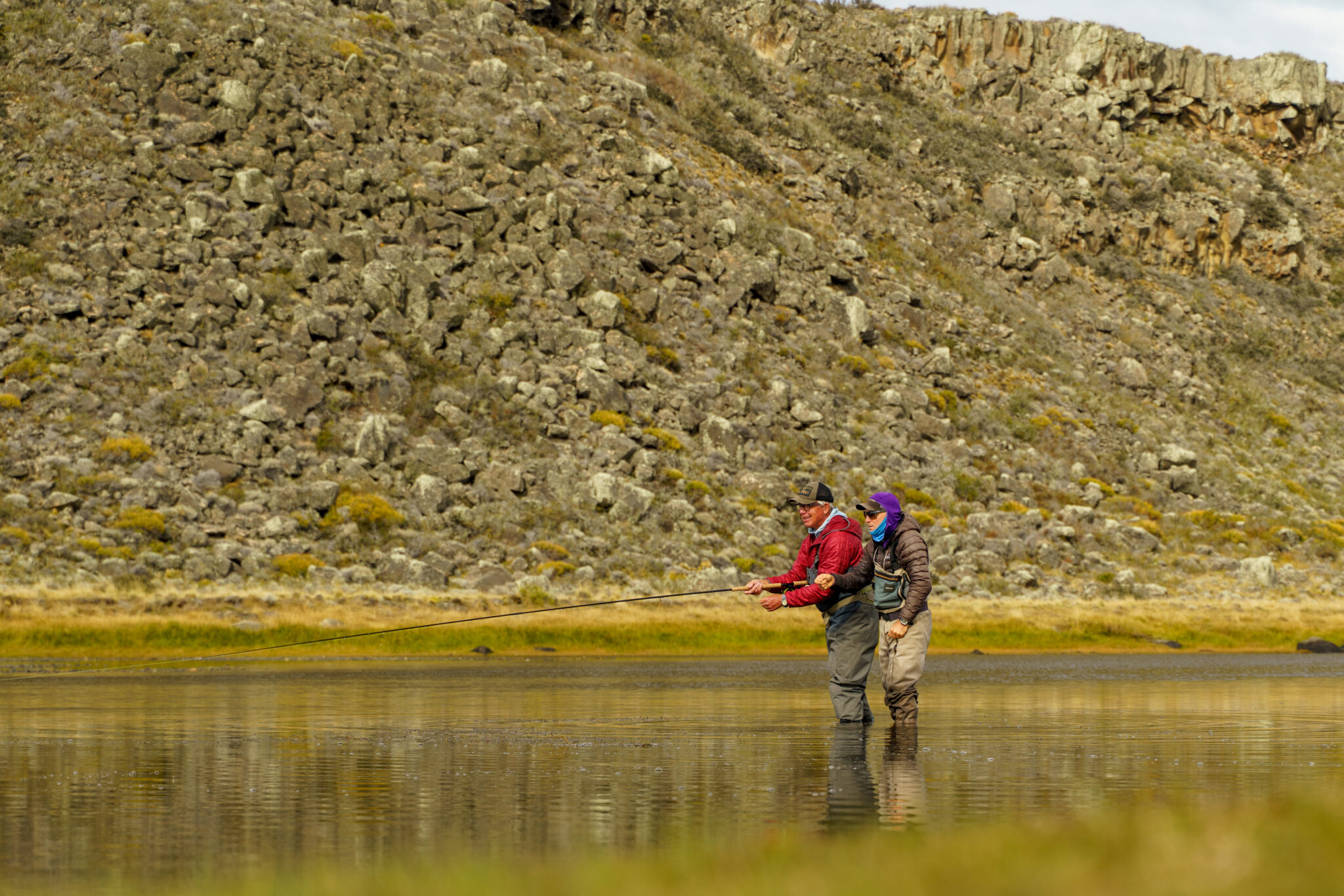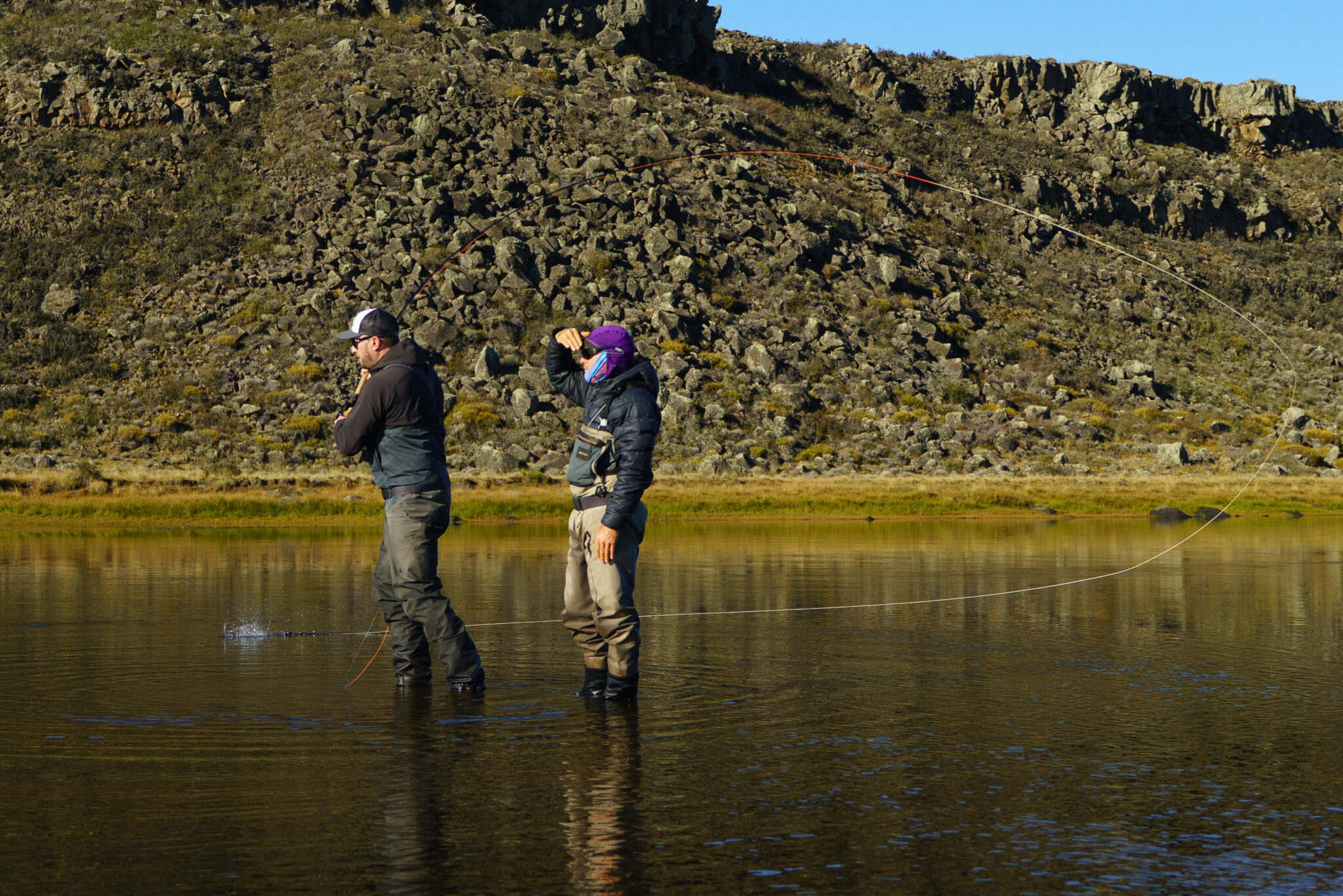 Guided by Cristián, who knows the pool intimately, they rigged up with a 3 IPS tip and a relatively large bead-head nymph. Working the head of the pool slowly and deep, nothing happened during the first few casts.